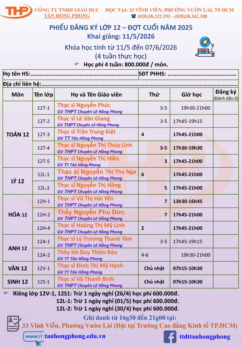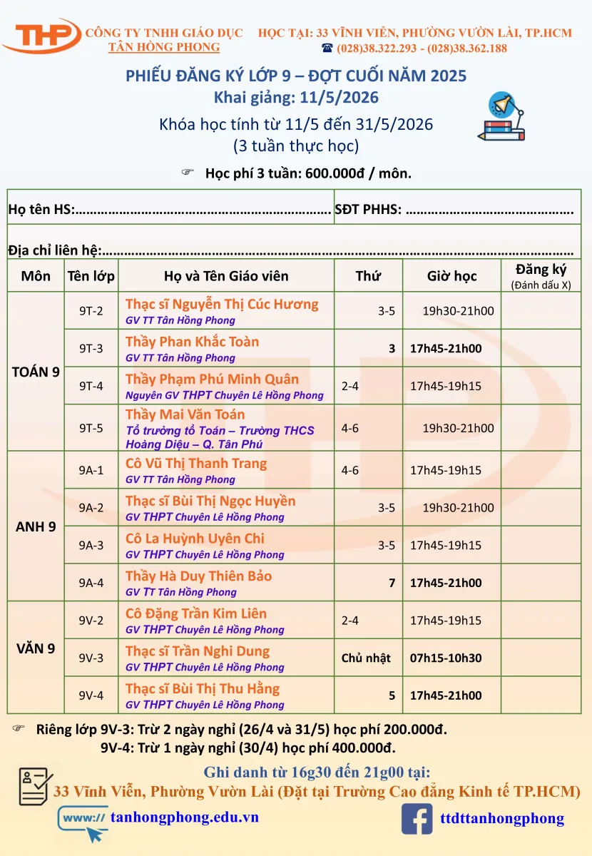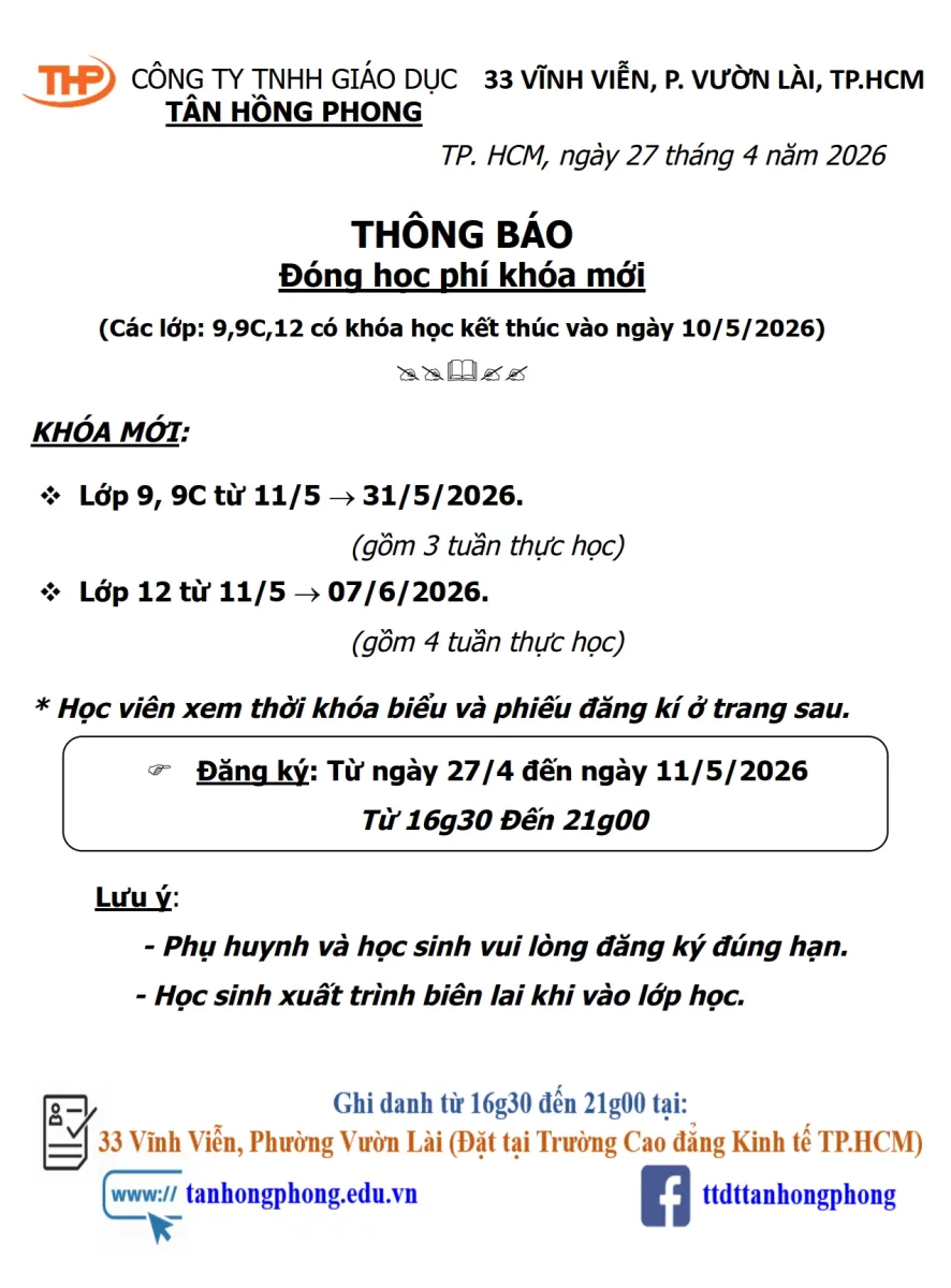 ĐÓNG HỌC PHÍ KHÓA MỚI 11/05/2026
