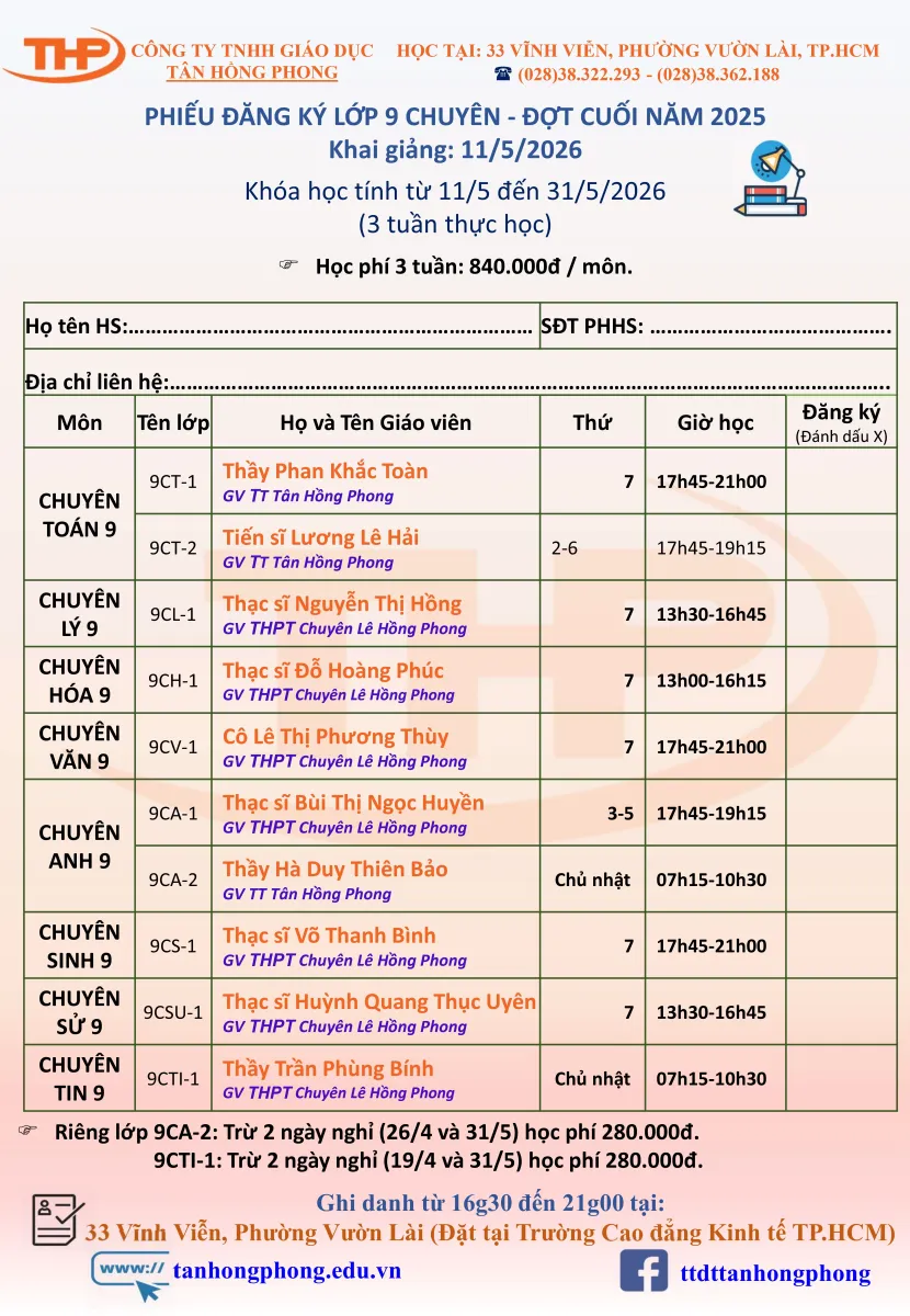 Lớp Luyện Thi Môn Chuyên Vào Lớp 10 Khai Giảng Khóa 09/02/2026